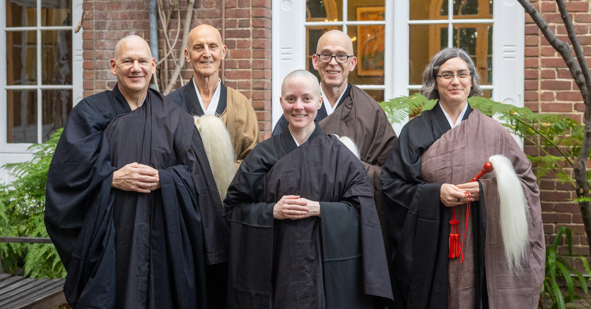 Pictured l-r: Michael Novak, Ryushin Paull Haller, Lauren Daniewicz, Anshi Zachary Smith, Abbot Mako Voelkel