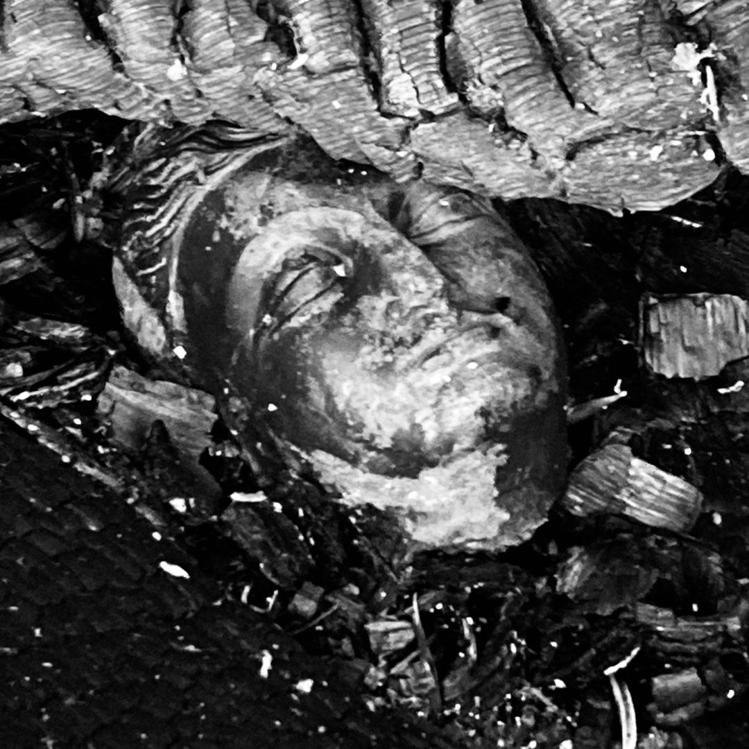 Still intact amid the rubble is the head of the 2,000 year-old stone Buddha that was the centerpiece of the zendo altar.
