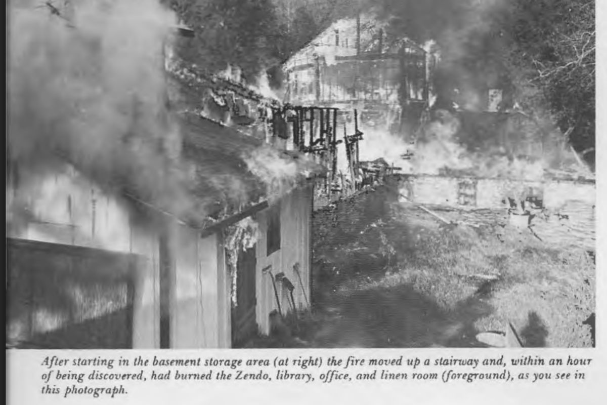 This photo shows the April 1978 fire that burned the original zendo along with several other structures. It is from the 1978-79 WInter issue of Windbell.